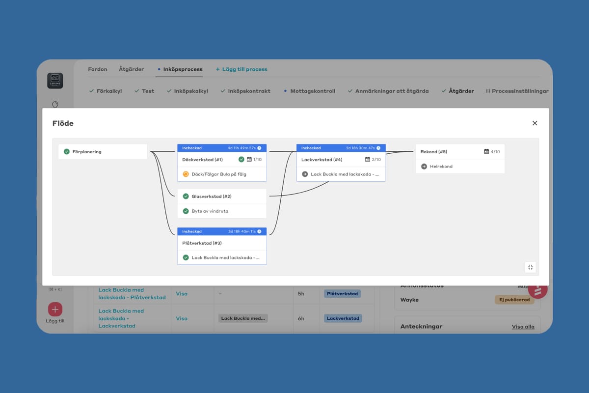 Med denne modulen, gir vi deg muligheten til å effektivisere flyten fra før bilen har ankommet til den er klar til publisering og salg. Du får kontroll på ledetider, og kan ha full kontroll på flaskehalser i bilens prosessteg.
