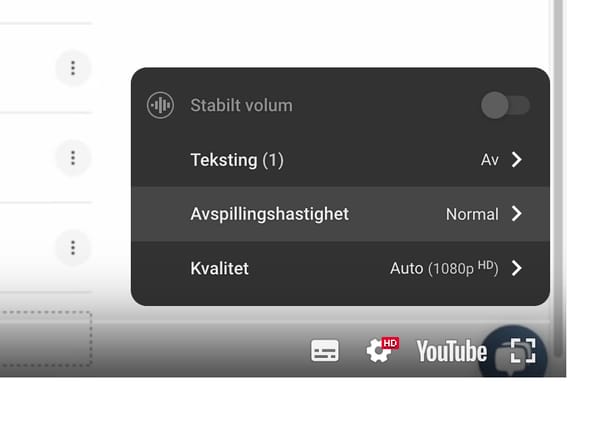 Om tempo i videoene er for raskt eller tregt for deg kan du justere ved å trykke på "tannhjulet" ved siden av "YouTube"-logoen nederst til høyre.